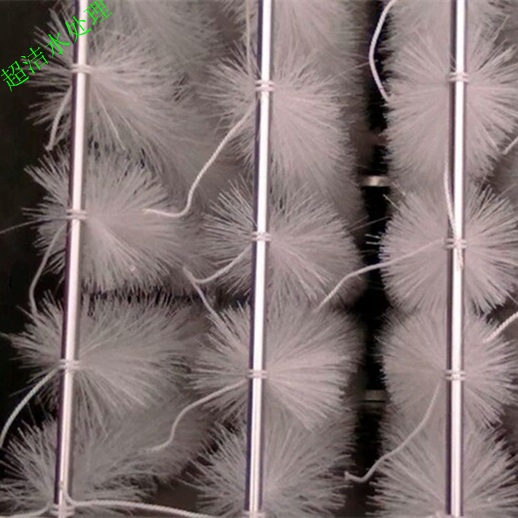 立体弹性填料筛选了聚烯烃类和聚酰胺中的几种耐腐、耐温、耐老化的优质品种,混合以亲水、吸附、抗热氧等助剂,采用特殊的拉丝,丝条制毛工艺,将丝条穿插固着在耐腐、高强度的中心绳上,由于选材和工艺配方精良,刚柔适度,使丝条呈立体均匀排列辐射状态,制成了悬挂式立体弹性填料的单体,填料在有效区域内能立体全方位均匀舒展满布,使气、水、生物膜得到充分混渗接触交换,生物膜不仅能均匀的着床在每一根丝条上,保持良好的活性和空隙可变性,而且能在运行过程中获得愈来愈大的比表面积,又能进行良好的新陈代谢,这一特征与现象是国内目前其他填料不可比拟的。